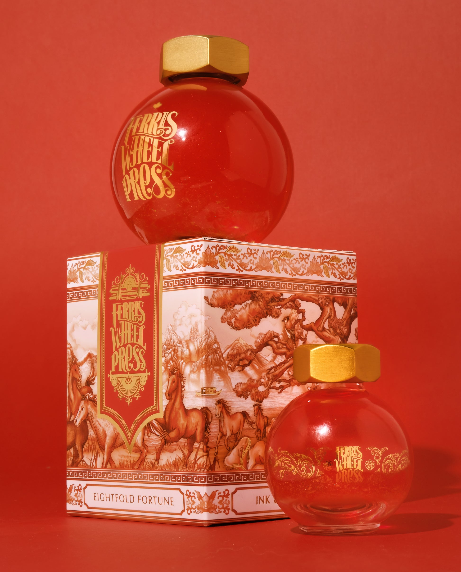 Eightfold Fortune es una tinta rojo carmesí intenso con shimmer champán rosado, creada para celebrar el Año del Caballo del calendario chino. Es la edición especial de Año Nuevo Lunar de 2026, una serie que Ferris Wheel Press lanza cada año —esta vez, por primera vez, en formato FerriTales.