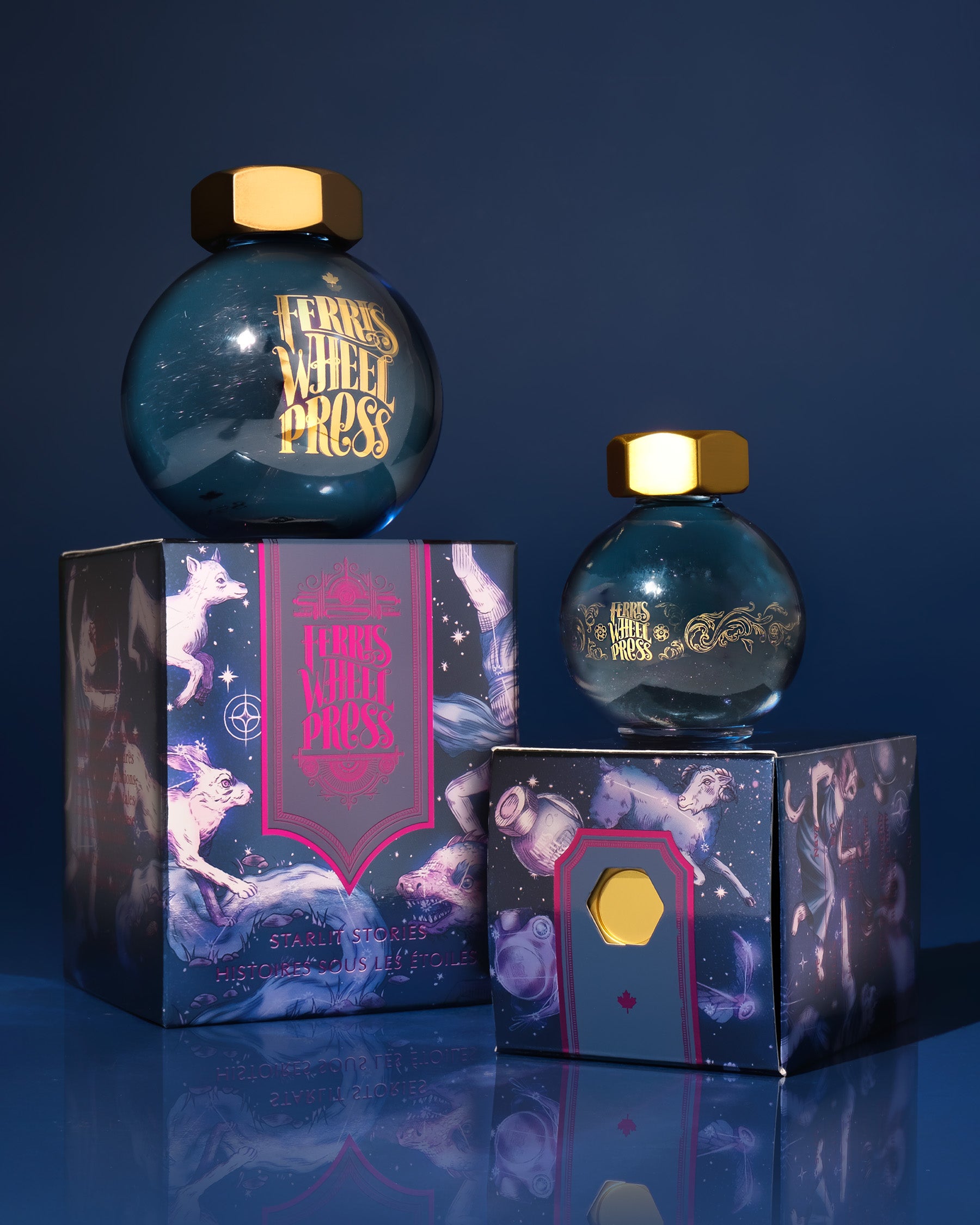 Starlit Stories es una tinta profunda y envolvente que combina un tono navy (azul noche) con purpurina dorada-rosada y sombreado medio, evocando cielos estrellados donde cada trazo parece una constelación. Forma parte de la colección Ferritales: Bestiary Series, que da vida a criaturas mágicas y mundos que solo aparecen al caer la noche. Estas son sus características principales: