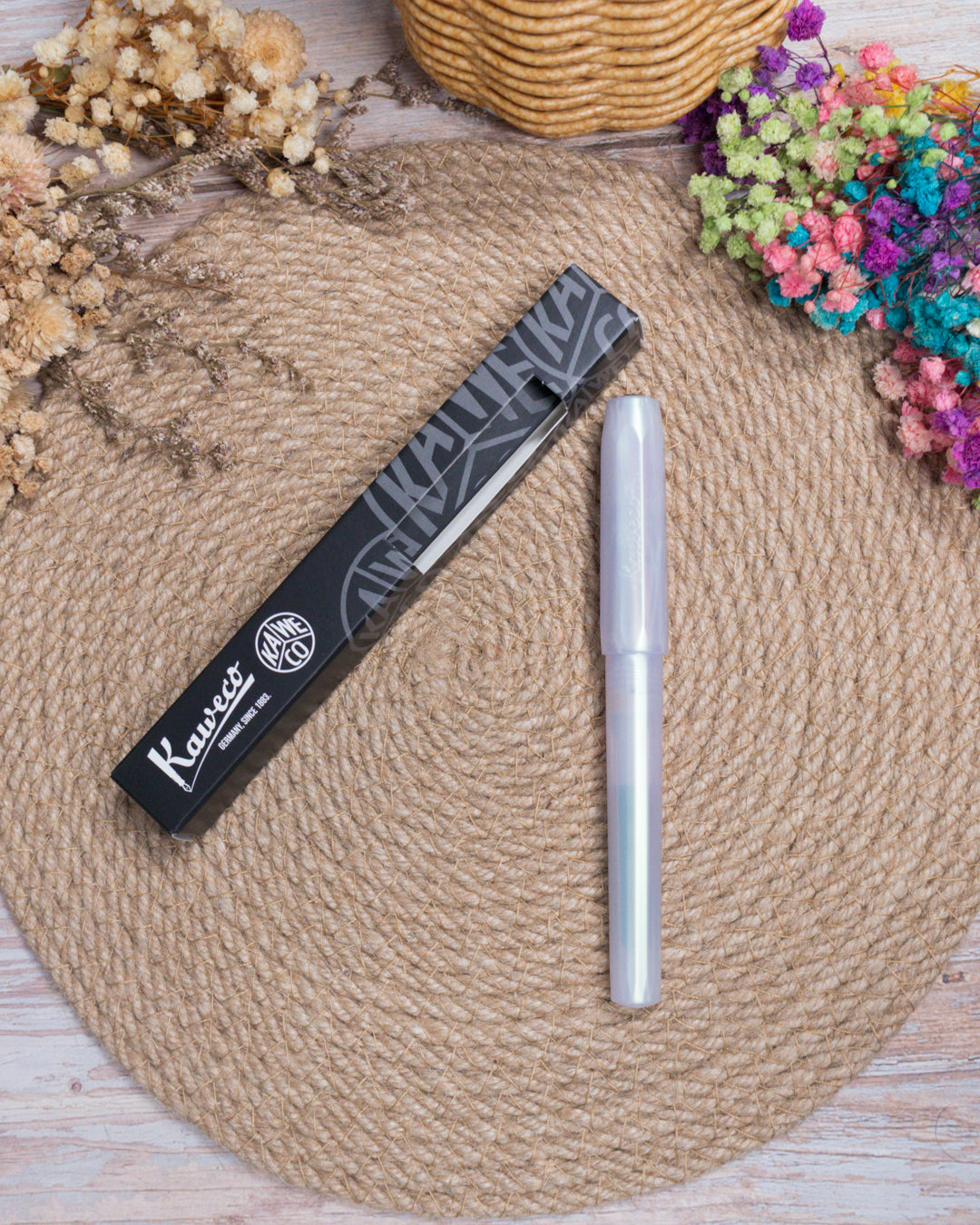 La Kaweco Perkeo Iridescent Pearl es una versión especial de la gama Perkeo con acabado irisado. Su cuerpo presenta reflejos perlados que cambian ligeramente según la luz, aportando un efecto más luminoso y diferente respecto a los colores sólidos habituales.