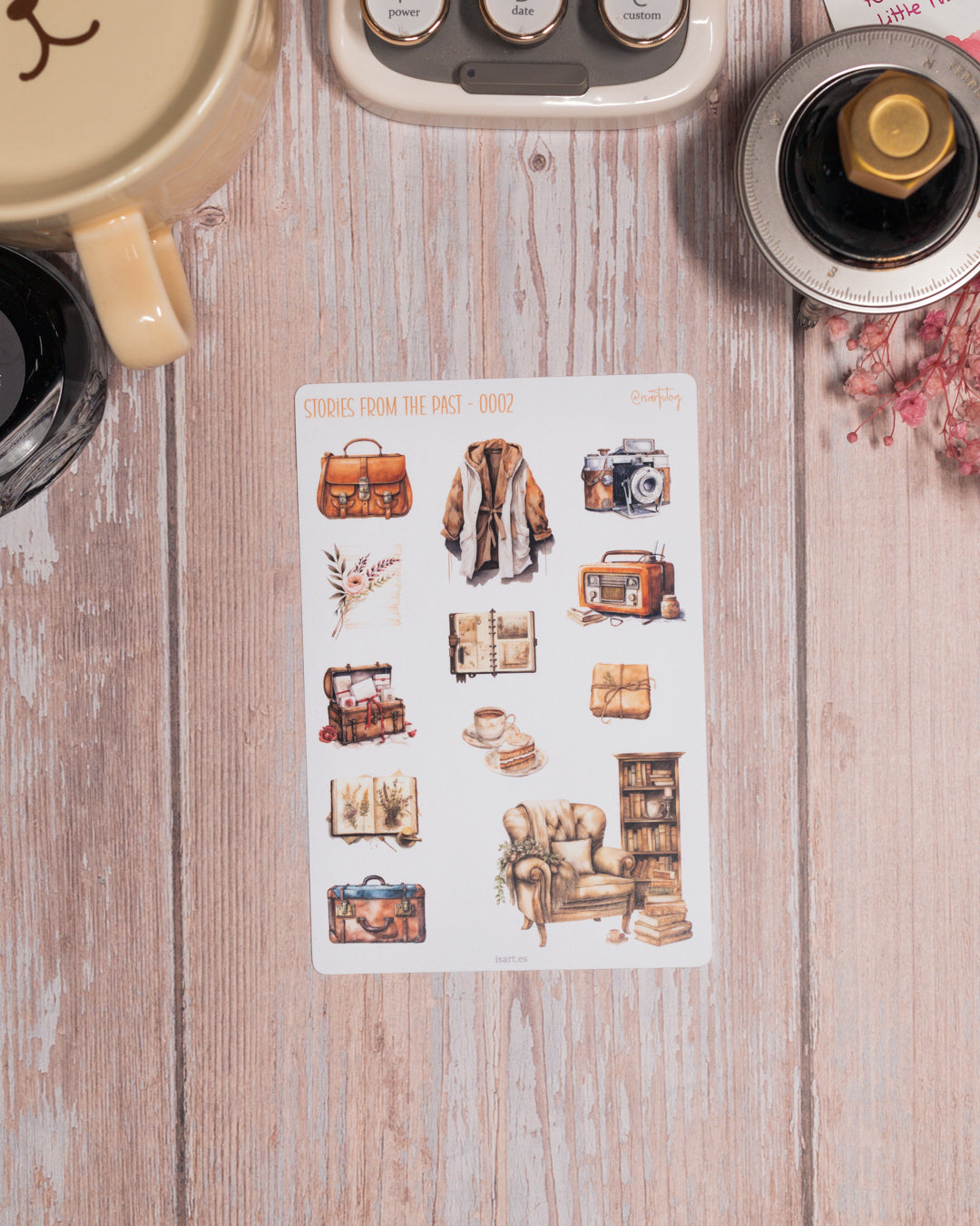 Una colección de pegatinas que celebra la belleza de lo antiguo: cámaras retro, libros gastados, muebles con historia y rincones que evocan otros tiempos. Perfectas para añadir un toque elegante y evocador a tus proyectos.